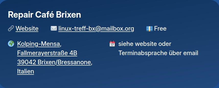 Das Repair-Café findet von September bis Juni jeweils von 18 bis 20:30 Uhr in der Kolping-Mensa in der Fallmerayerstraße 4 B in 39042 Brixen statt. Wenn du Fragen hast, an den Terminen nicht teilnehmen kannst oder dich anmelden möchtest, um die Wartezeit zu reduzieren und uns bei der Organisation zu helfen, schreib uns einfach an linux-treff-bx@mailbox.org.